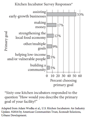 The growth of kitchen incubators is a testament to 39 its importance to burgeoning small businesses. A 2016 industry report notes that the number of kitchen incubators increased more than 50% from 2013 to 2016. A survey published in the report shows that most incubators surveyed (53%) 40 experienced growth during that time. While profits were paramount to 17% of incubators, others indicated that strengthening the local food economy (12%), helping people in need (5%), and building community (5%) were primary concerns.