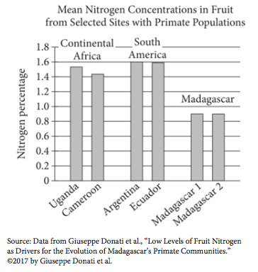 Sites were chosen in continental 5 Africa; South America, and Madagascar because primate families in these locations all have the same relative nitrogen requirements. At the continental African sites in Uganda and Cameroon, 6 however, the scientists found fruit to have nitrogen concentrations of 1.53 percent and 1.44 percent, respectively. The South American sites yielded similar results, with nitrogen concentrations in fruit