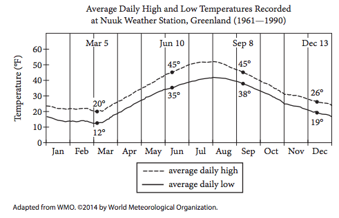 Most of Greenland’s interior is covered by a thick layer of ice and compressed snow known as the Greenland Ice Sheet. The size of the ice sheet fluctuates seasonally: in summer, average daily high temperatures in Greenland can rise to slightly above 50 degrees Fahrenheit, partially melting the ice; in the winter, the sheet thickens as additional snow falls, and average daily low temperatures can drop 12 to as low as 20 degrees.