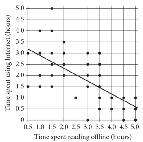 In a certain school district, 36 high school students were selected at random for a study on Internet use and offline reading habits. During October, each student reported the average amount of time, to the nearest half hour, spent reading offline on Saturdays and the average amount of time, to the nearest half hour, spent using the Internet on Saturdays. The scatterplot above shows the times recorded by the students. A line of best fit is also shown.