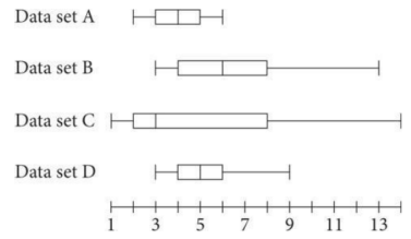Question 18: The box plots shown summarize the data in each of four data sets. Which of the four data sets has a range of 6 ?