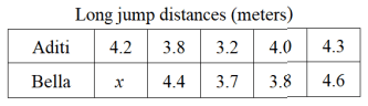 Question 35: Aditi and Bella each attempted the long jump five times during a track meet, and their distances are shown in the table. The mean distance for Bella’s attempts was 0.3 meter greater than the mean distance for Aditi’s attempts. What is the value of x?