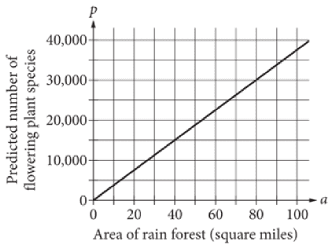 Question 10: The graph models the relationship between the area of a rain forest a, in square miles, and the predicted number of flowering plant species, p, found in that area. What equation represents this relationship?