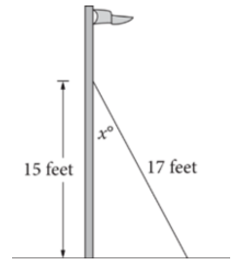 Question 20: The figure shows the mast of a boat that is installed perpendicular to the deck of the boat. The mast is secured by a rope that is anchored to the deck. The rope measures 17 feet long and makes an angle of x° with the mast. The point where the rope is attached to the mast is 15 feet above the deck. What is the value of tan(x°) ?