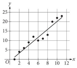 Question 11: The scatterplot shows the relationship between two variables, x and y. A line of best fit is also shown. For how many of the data points does the line of best fit predict a greater y-value than the actual y-value?