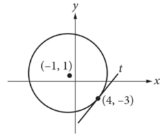 Question 20: The circle shown has center (−1,1) . Line t is tangent to this circle at point (4,−3). Which of the following points also lies on line t?