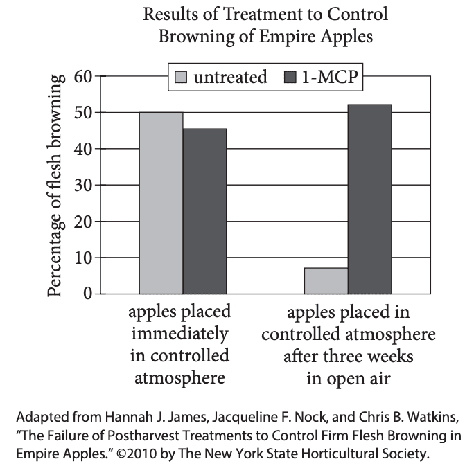 Traditionally, apple producers have dealt with this problem by leaving the apples in the open air for three weeks before storing them in a controlled atmosphere with tightly regulated temperature, humidity, and carbon dioxide levels. As the graph shows, the flesh of untreated Empire apples that are first stored in the open air undergoes 31 roughly five percent less browning than the flesh of untreated Empire apples that are immediately put into storage in a controlled environment. However, when Empire apples are treated with 1-MCP, 32 their flesh turns brown when the apples are first stored in the open air, though not under other conditions. Although researchers continue to search for the right combination of factors that will keep fruits fresh and attractive, 33 the problem may be that consumers are overly concerned with superficial qualities rather than the actual freshness of the fruit.
